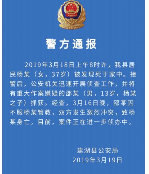 3月19日中午12时许,盐城市建湖警方发布通报称,2019年3 月18日上午8时许,建湖县居民杨某(女,37 岁)被发现死于家中。接警后,公安机关迅速开展侦查工作,并将有重大作案嫌疑的邵某(男,13 岁,杨某之子)抓获。经查,3月16日晚,邵某因不服杨某管教,双方发生激烈冲突,致杨某身亡。目前,案件正在进一步侦办中。