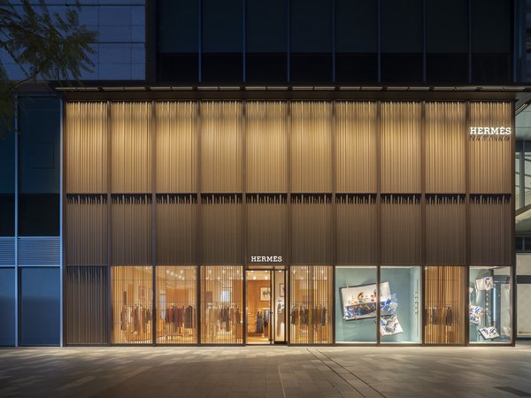 爱马仕厦门专卖店坐落于厦门华润万象城一层,占地253平方米,设有沿街及商场内部共三个入口,建筑外立幕墙由细长金属管垂直排布而成,光影曼妙灵动,底部的玻璃门窗饰以竹帘元素,静谧温馨的氛围流泻而出。二者相得益彰,以影影绰绰的朦胧之美吸引着顾客步入其中,体验极致诗意典雅。
