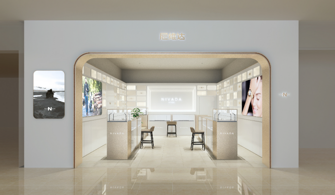 尼维达NIVADA全新店铺形象在保持品牌一贯的优雅、轻奢氛围中,融合东方美学设计灵感,使门店整体风格更加年轻摩登。尼维达NIVADA全新店铺的设计宗旨是让腕表与陈列空间亲密互动,严谨的多维视觉效果,仿佛是尼维达精湛制表技术的体现。店铺外立面由三层厚重的金属外框叠加而成,外形犹如腕表的金属外壳一样,暗喻整个店铺空间为腕表的内部空间,将腕表的层次与构造得以体现。店铺内部设计,以长方形体块的尺寸为标准,将整个空间分层化,增加空间的层次感和纵深感。将腕表的内在美学价值赋予顾客独特的环境当中。为了秉承可持续的设计理念和年轻的创新精神,使设计运用至不同形式及尺寸的商品展示,将背柜进行单元化处理,可垂直叠加长方形体块来组成背柜,这一过程就像腕表表带的可调节功能一样,通过调整水平垂直方向的长方体体块的数量,来调节背柜的大小及高低,使设计能被灵活运用到不同的店铺中。融合品牌产品时尚百搭与定制的概念,赋予了每个单元格可更换功能。单元格的材质可以根据周围的环境氛围,季节,新产品印象等要素进行定期的更换,以达到更好的适应融合。