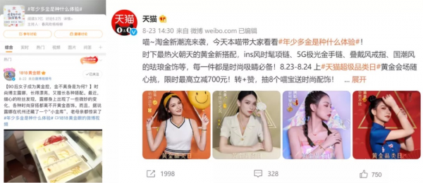 洞察到现在年轻消费群体在做出黄金产品的购买决策时,热衷于在主流社交媒体上(如微博、小红书)进行信息了解与产品挑选,线上种草消费的渗透率极高。为此,黄金品类日携手天猫时尚配饰行业数十家头部黄金品牌,在社交平台上发起“升级你的淘金新潮流”的营销活动。
