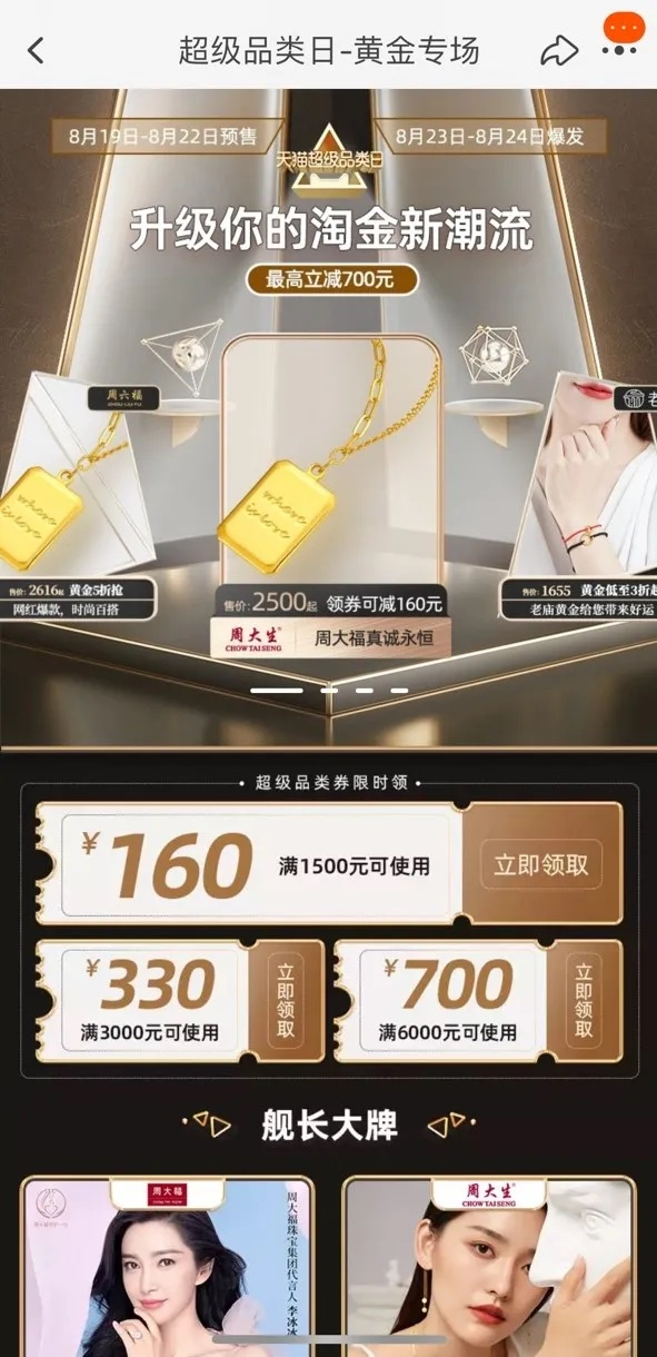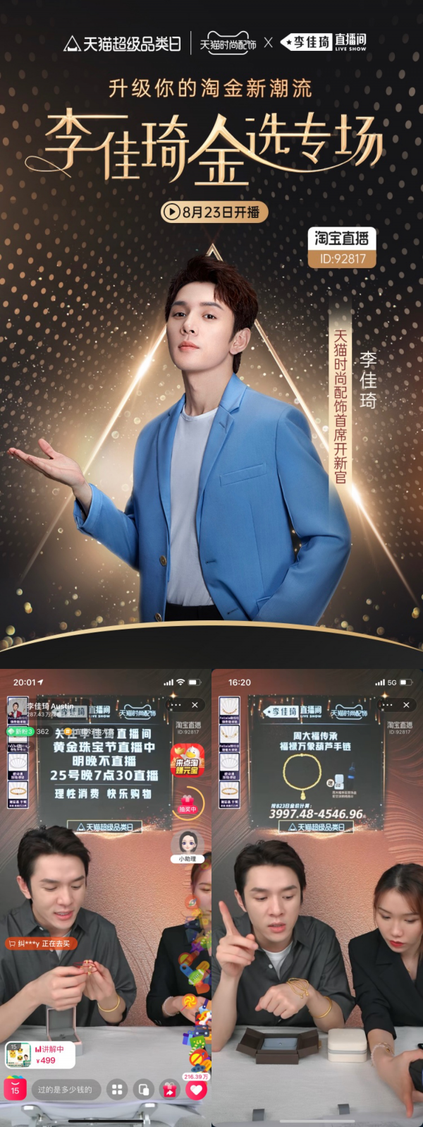 此外黄金品类日还联合天猫时尚配饰首席开新官李佳琦打造黄金金选专场,以超级直播场景驱动品类趋势升级,为年轻潮流、高净值品质消费者带来一场与众不同的“金”致生活新体验。